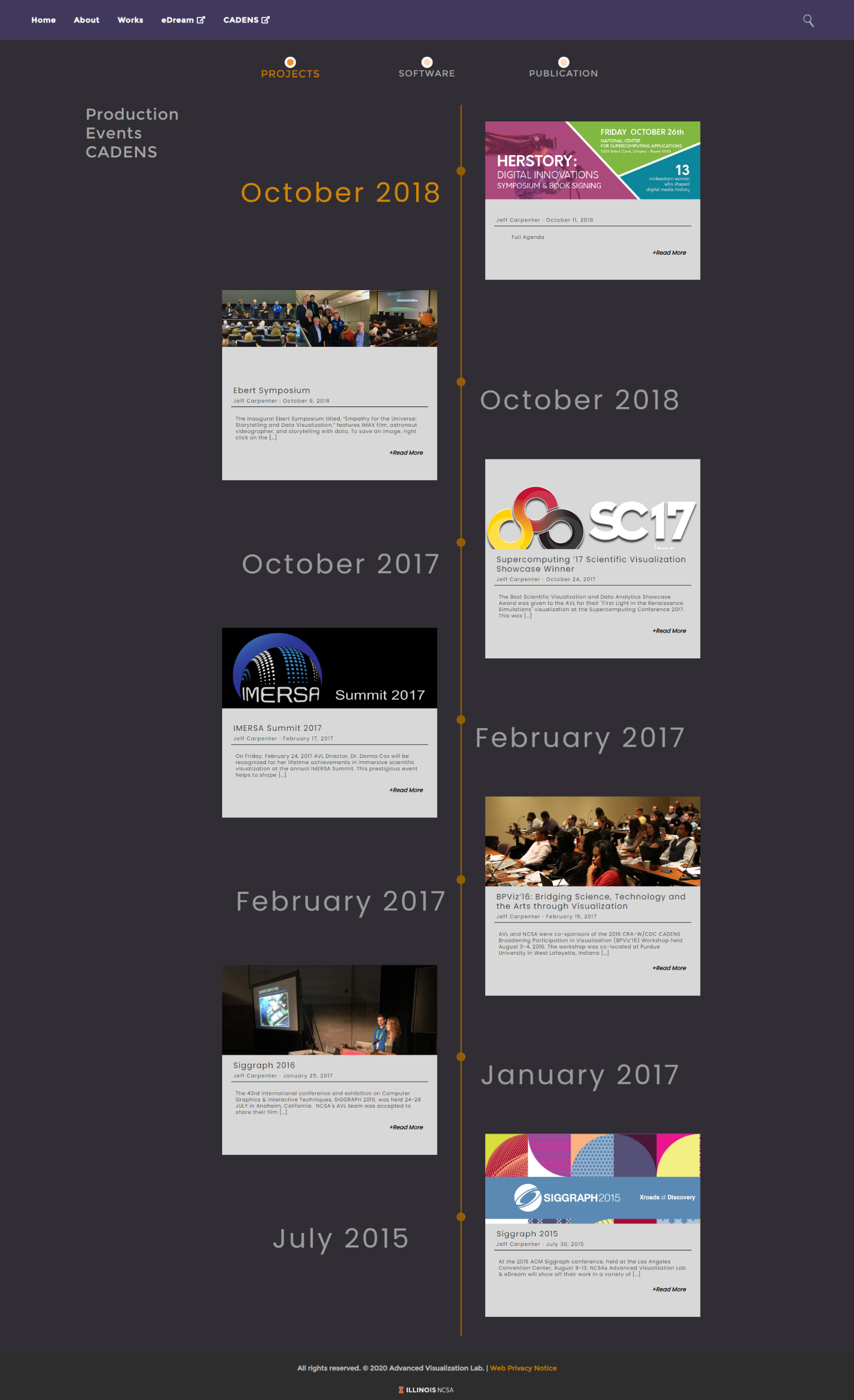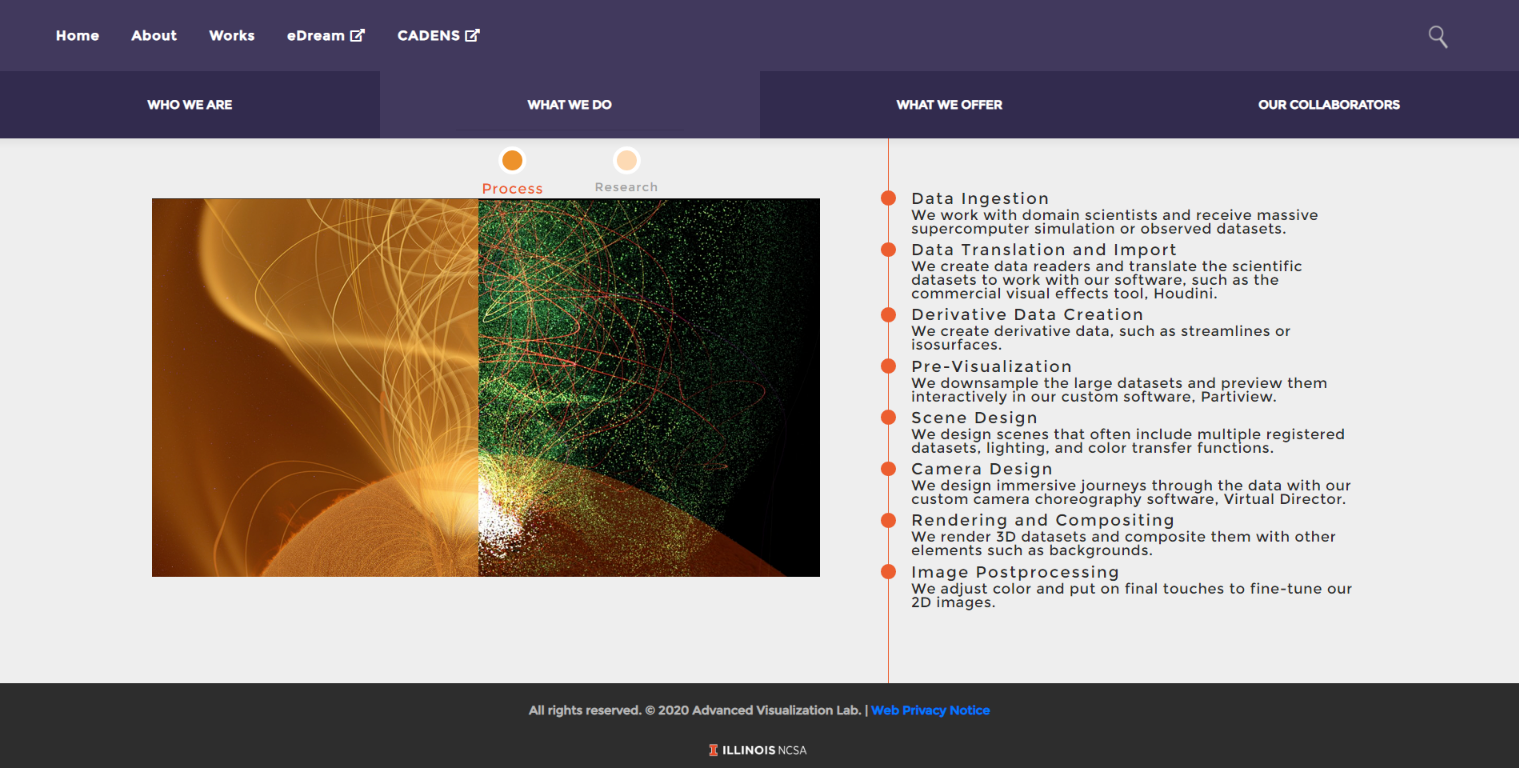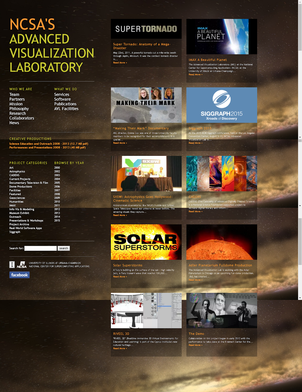 During my SPIN (student-pushing innovation) internship at the Advanced Visualization Lab (AVL) at the National Center for Supercomputing Applications (NCSA) while I was a student at UIUC, I developed a new WordPress theme for the AVL’s website based on our design intern Dawn Nguyen’s designs.